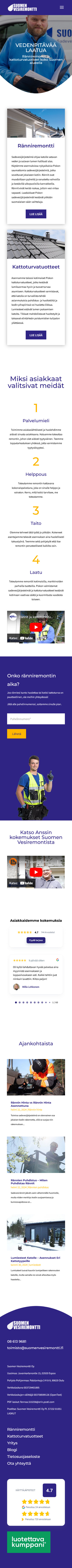 Suomenvesiremontti Oy (SVR) on erikoistunut ränniremontteihin sekä tarjoaa kattoturvatuotteita ja sadevesijärjestelmiä. Suomenvesiremontti Oy tunnetaan alalla luotettavana toimijana, joka näkyy asiakkaiden palautteista.